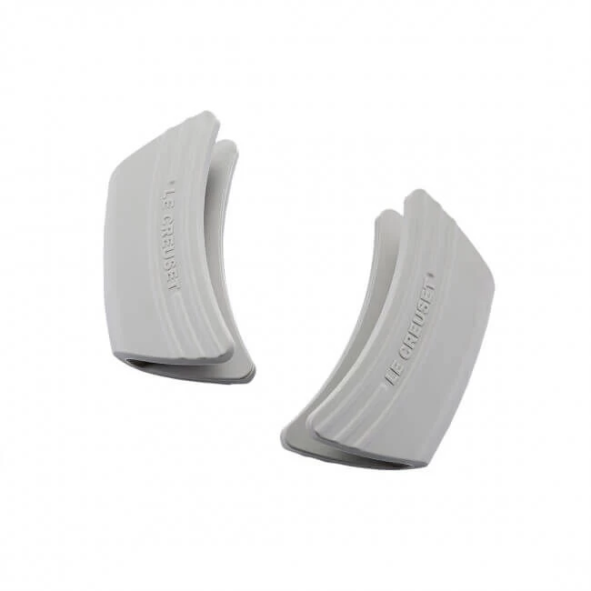 De Le Creuset handvatten zijn gemaakt van licht grijs silicone 12 cm lang en 6,5 cm breed. De handvatten hebben een rond ontwerp dat over de handgrepen van uw braad-/stoofpan glijdt en uw handen beschermt bij het optillen. Het materiaal barst en verkleurt niet en neemt geen vlekken op.