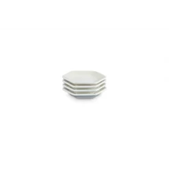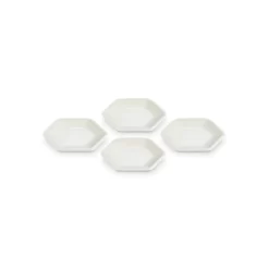 De vier Le Creuset serveerschaaltjes zijn gemaakt van geglazuurd aardewerk, uitgevoerd in crèmekleur. De schaaltjes zijn 8,5 cm breed, 9,5 cm lang en 1,5 cm hoog. Gebruik om (dip)sauzen te serveren.