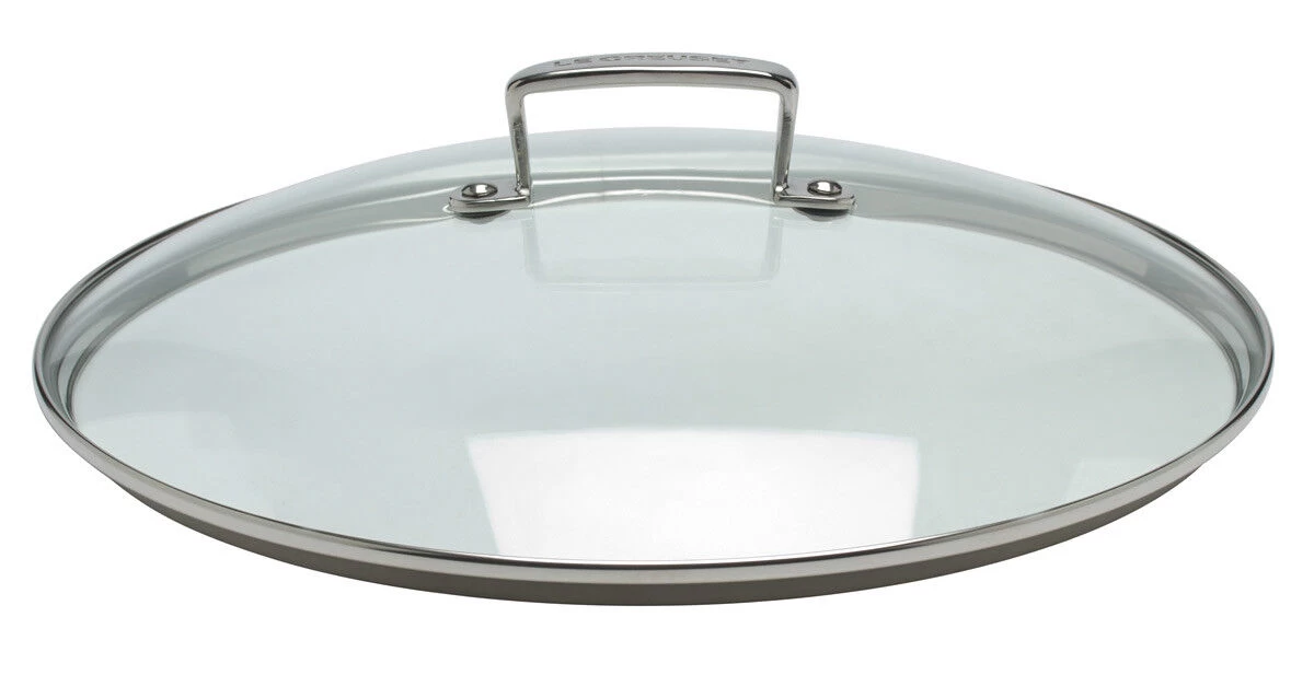 Het glazen deksel van Le Creuset is zeer resistent door het geharde glas en de smalle roestvrijstalen rand.