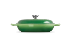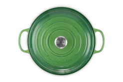 De multifunctionele geëmailleerde gietijzeren lage braadpan van Le Creuset heeft een diameter van 30 cm. Met een inhoud van 3,2 liter heeft de bamboo, groene, pan ruimte om voor 6 personen bijvoorbeeld vlees of aardappelen te bereiden. Het lage elegante formaat maakt de pan zeer geschikt om uw gerechten in op te dienen.