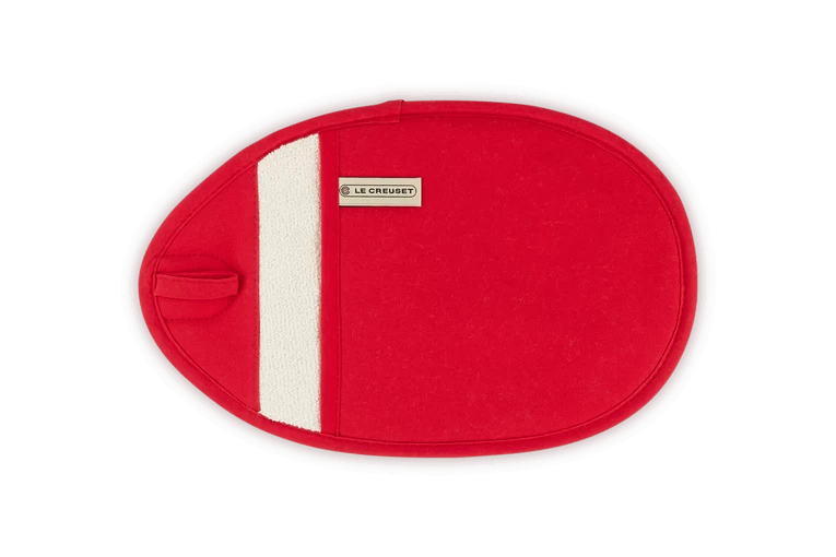 De Le Creuset pannenlap is gemaakt van rood katoen en heeft een lengte van 31 cm en is 21 cm breed. De pannenlap is behandeld met nylon waardoor deze vocht- en vuilafstotend is. Gebruik de pannenlap om producten van het fornuis of uit de oven te pakken.
