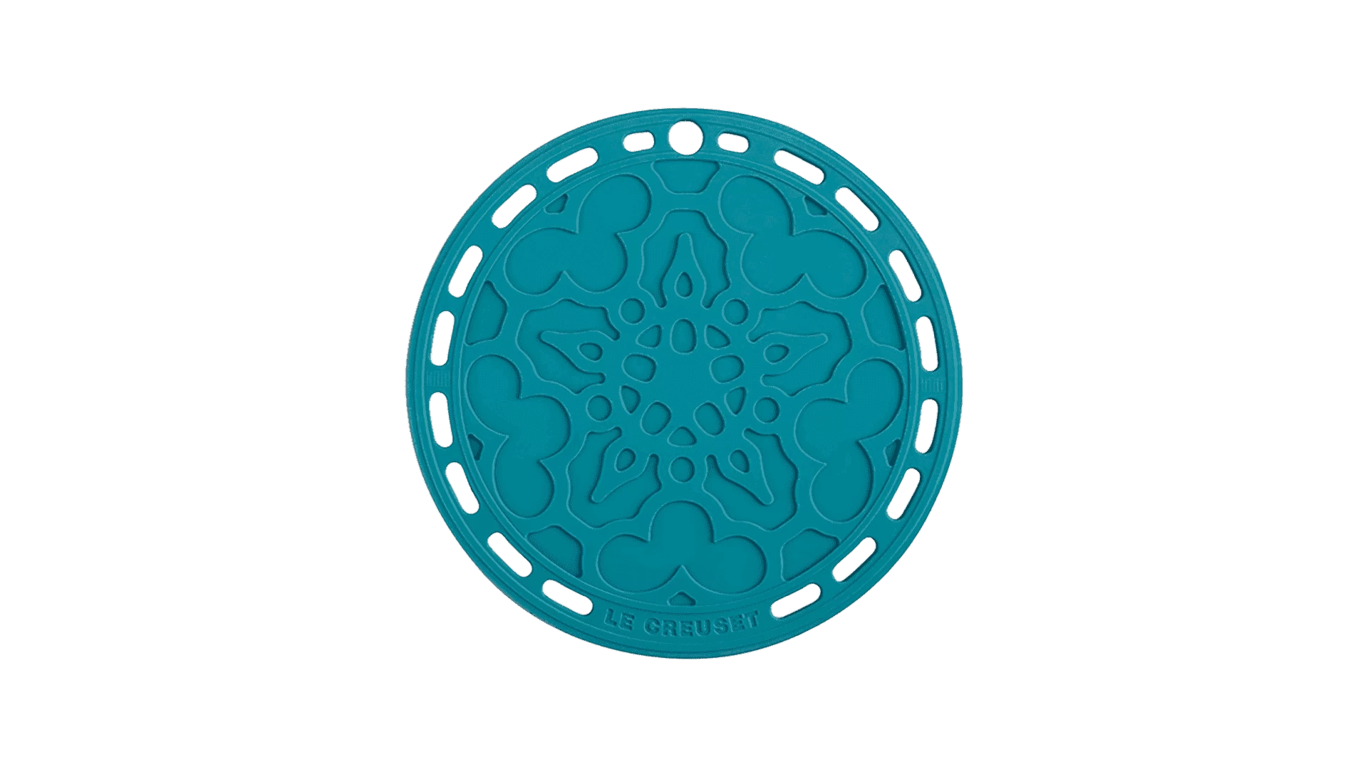 De Le Creuset pannenonderzetter is gemaakt van blauwe silicone en heeft een diameter van 20 cm. Gebruik de Caribbean Blue, flexibele lap als onderzetter of als pannenlap.