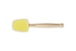 De gele Le Creuset grote spatel is gemaakt van hout en heeft een siliconen blad, waardoor de spatel niet krast. De spatel heeft een platte en bolle zijde en heeft een lengte van 28 cm. De breedte van het blad is 7 cm.