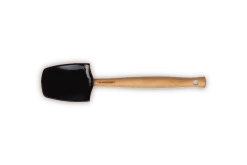 De zwarte Le Creuset grote spatel is gemaakt van hout en heeft een siliconen blad, waardoor de spatel niet krast. De spatel heeft een platte en bolle zijde en heeft een lengte van 28 cm. De breedte van het blad is 7 cm.