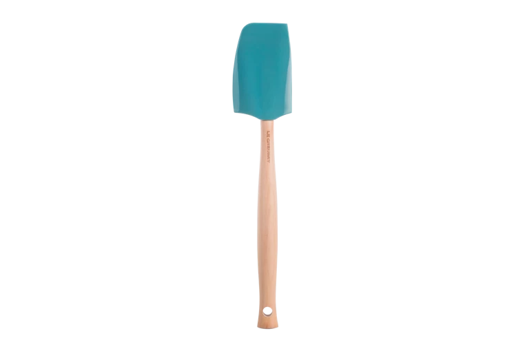 De Le Creuset Premium Medium spatel is gemaakt van hout en heeft een Caribbean blauwe siliconen blad, waardoor de spatel niet krast. De spatel heeft een platte en bolle zijde en heeft een lengte van 28,5 cm. De breedte van het blad is 5,8 cm.