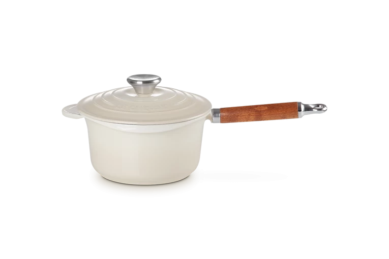De Signature steelpan van Le Creuset heeft een diameter van 18 cm en is uitgevoerd in meringue kleur. De ronde pan van geëmailleerd gietijzer heeft een inhoud van 1,8 liter, geschikt voor 2 personen. Aan de pan zit een houten steel geschroefd, die bij gebruik niet warm wordt.