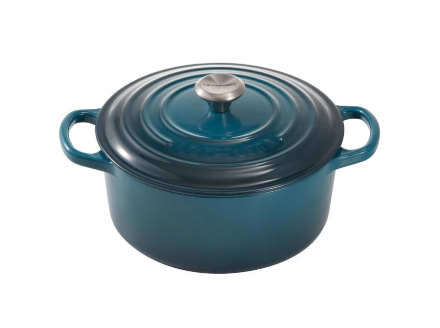 De Deep Teal – blauwgroene – Signature braadpan van Le Creuset heeft een diameter van 20 cm. De ronde pan van geëmailleerd gietijzer heeft een inhoud van 2,4 liter, bedoeld voor 2 tot 4 personen. De braad-/ stoofpan heeft extra grote grepen. De ronde vorm maakt de Signature braadpan geschikt voor soep en stoofgerechten als boeuf bourguignon.