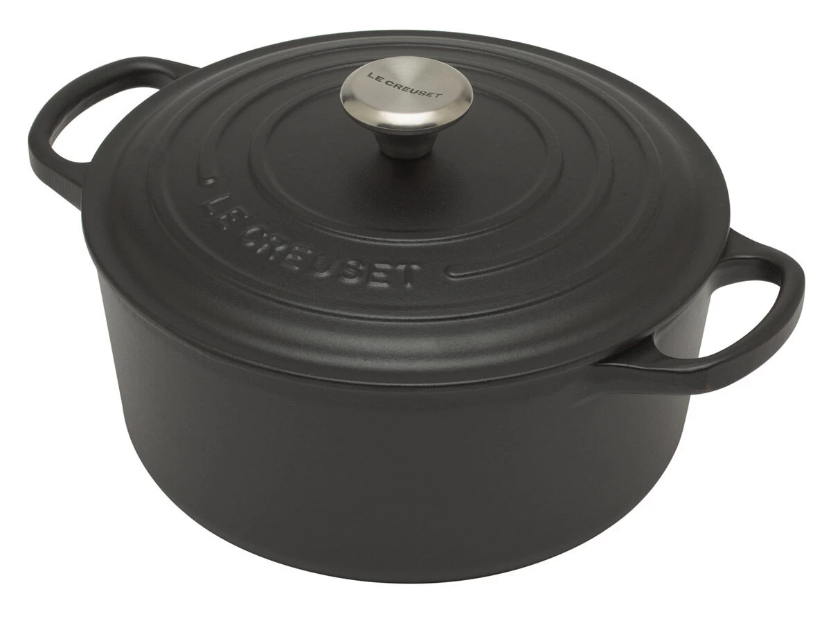 De matzwarte Signature braadpan van Le Creuset heeft een diameter van 22 cm. De ronde pan van geëmailleerd gietijzer heeft een inhoud van 3,3 liter, bedoeld voor 4 personen. De braad-/ stoofpan heeft extra grote grepen. De ronde vorm maakt de Signature braadpan geschikt voor soep en stoofgerechten als boeuf bourguignon.