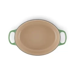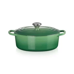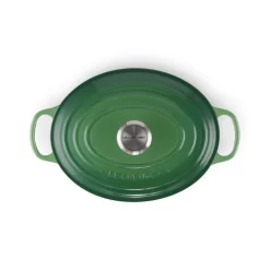 De bamboo – groene- braadpan van Le Creuset heeft een diameter van 29 cm. De ovale pan van geëmailleerd gietijzer heeft een inhoud van 4,7 liter, bedoeld voor 6 personen. De braad-/ stoofpan heeft extra grote grepen. De ovale vorm maakt de pan geschikt voor langwerpige stukken vlees en gevogelte.