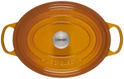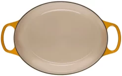 De Nectar, okergele, braadpan van Le Creuset heeft een diameter van 31 cm. De ovale pan van geëmailleerd gietijzer heeft een inhoud van 6,3 liter, bedoeld voor 6 tot 8 personen. De braad-/ stoofpan heeft extra grote grepen. De ovale vorm maakt de pan geschikt voor langwerpige stukken vlees en gevogelte.