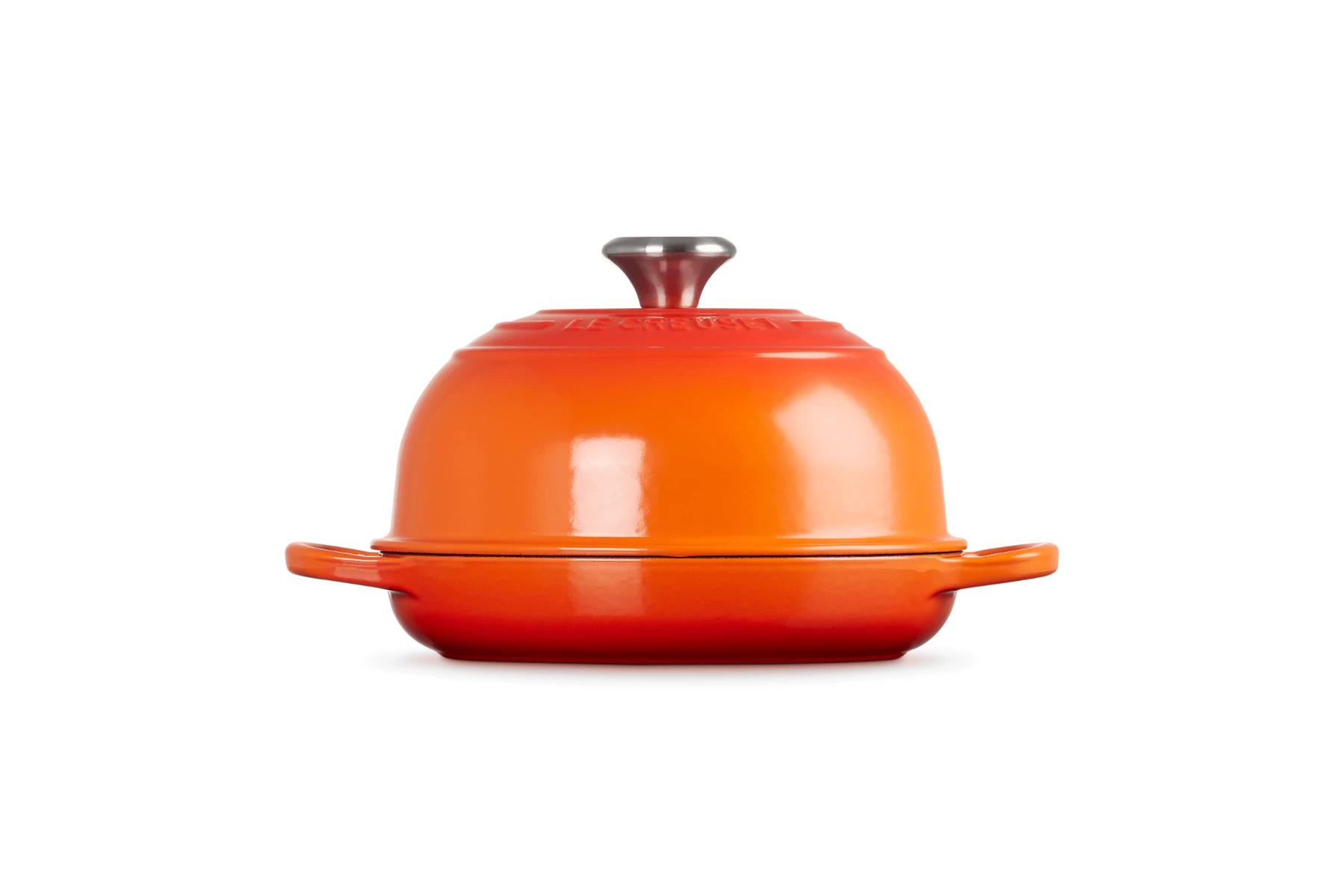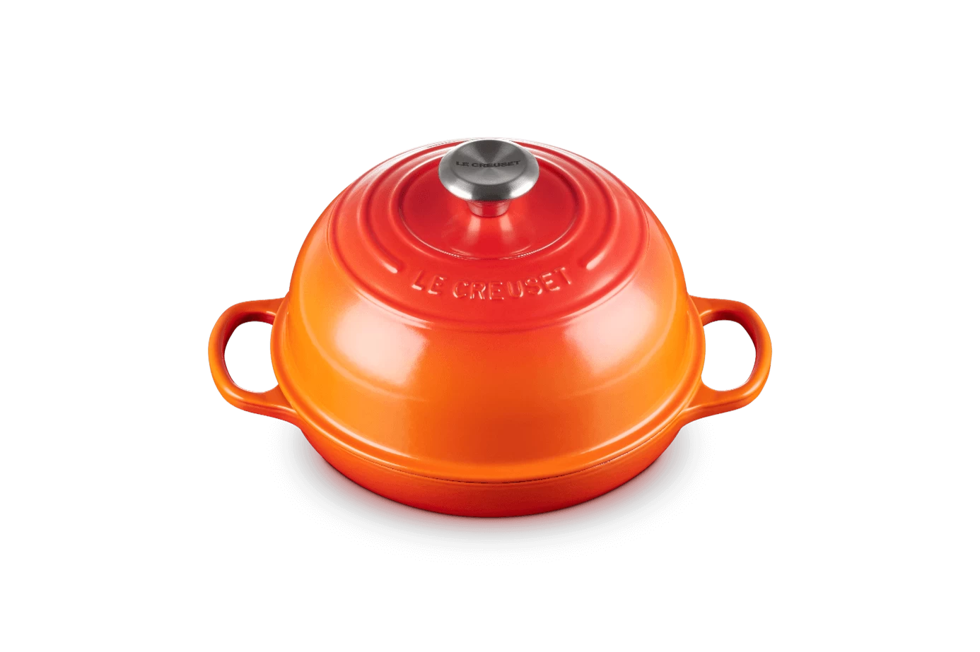 De vulcanique, oranjerode, Signature broodpan van Le Creuset heeft een diameter van 24 cm. De ronde broodbakpan is gemaakt van geëmailleerd gietijzer, heeft een inhoud van 1,6 liter en is voorzien van ergonomische grepen. Gebruik de Le Creuset broodpan voor het bakken van diverse soorten brood.