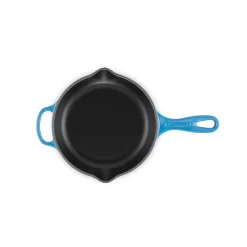 Het gietijzer van de Le Creuset Skillet is geëmailleerd en weerstaat hoge temperaturen. Kenmerkend aan de pan is de in één stuk meegegoten gietijzeren greep en de twee schenktuitjes. Let erop dat de handgreep warm kan worden en het gebruik van een pannenlap of ovenwant is aan te raden.